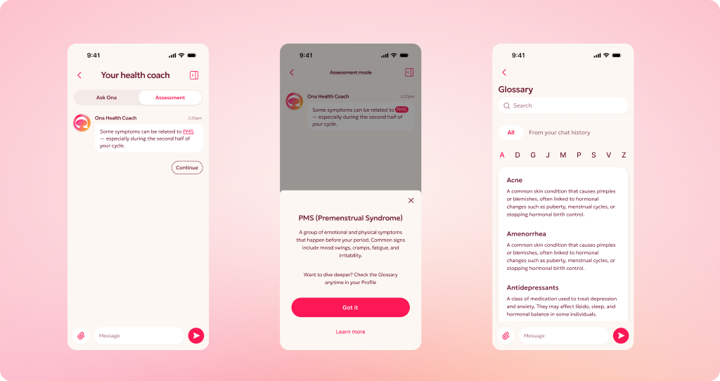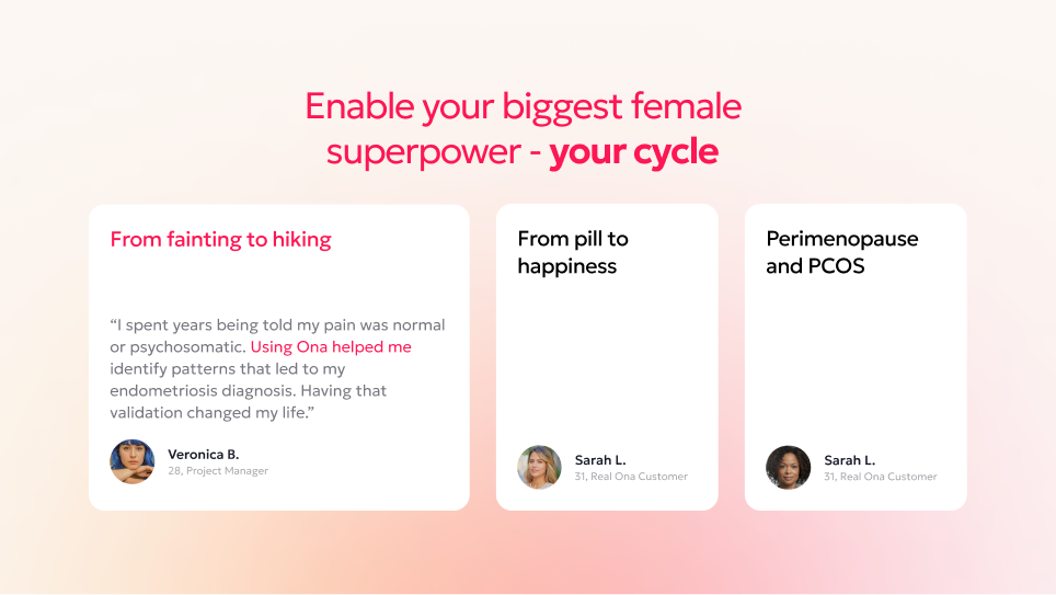 Powered by AI and backed by experts, Ona finds the trends your doctor might miss — giving you personalized insights to manage your menstrual health with clarity and control.